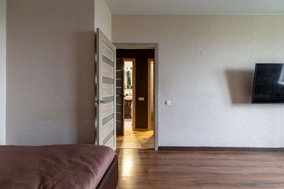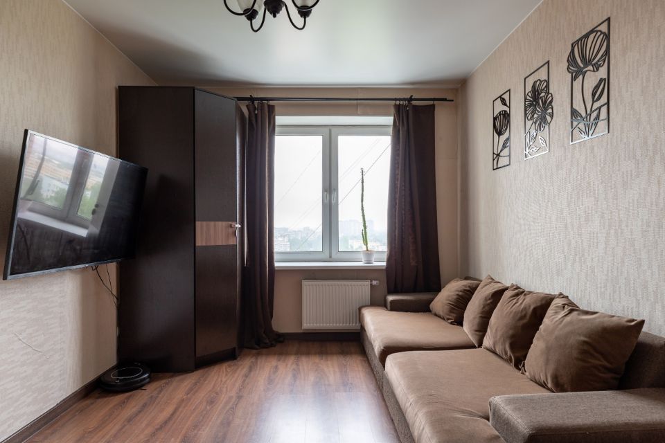 Напротив дивана — большой телевизор, чтобы вы могли расслабиться после насыщенных прогулок по городу. Включите любимый фильм или сериал — и отдых станет еще приятнее.